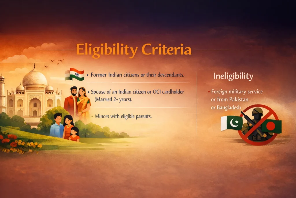 Ineligibility: Individuals with foreign military service or from Pakistan or Bangladesh cannot apply.