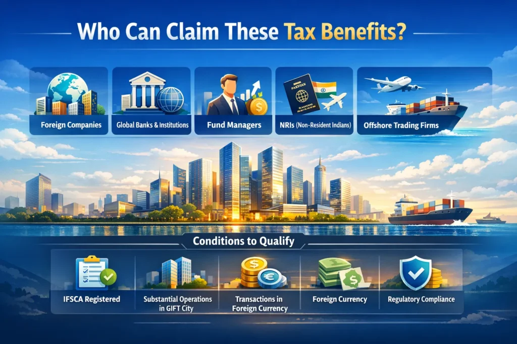 Conditions to Qualify: To claim these benefits, entities must be registered with IFSCA, maintain substantial business operations in GIFT City, comply with minimum capital requirements where applicable, conduct transactions primarily in foreign currency with non-resident counterparties, and adhere to all regulatory and compliance obligations under IFSC regulations.