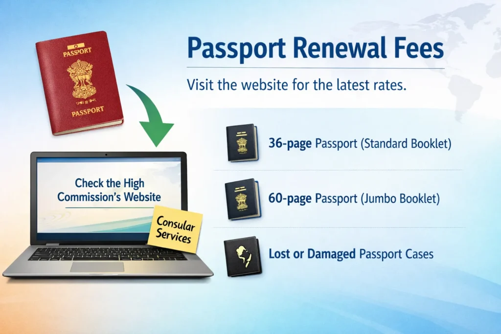 Fees vary depending on the type of passport (36-page or 60-page) and your situation (normal renewal, lost, or damaged). For the most current fees, check the High Commission’s official website under the Consular Services section. Fees are subject to change.