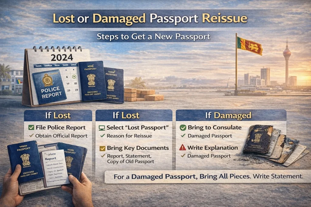 The very first step is to fill out the online application on the Passport Seva Online Portal for Indians Abroad. You must select Sri Lanka as your country and choose “Re-issue of Passport.” Print the completed application form before visiting the High Commission.