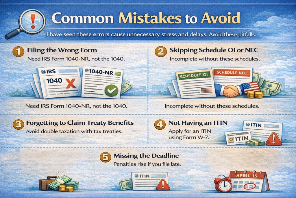 - Filing the Wrong Form: Do not accidentally file the standard 1040. It is for residents. You need the 1040-NR.