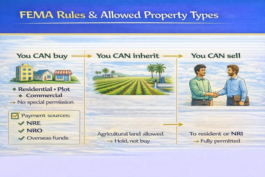 The good news is, as an NRI, you are generally allowed to buy any residential or commercial property in India. There is just one big exception. You cannot buy agricultural land, plantation property, or a farmhouse. That is reserved for Indian residents. This rule is set by the Foreign Exchange Management Act, or FEMA. It is the primary law that dictates how NRIs can deal with property and money in India.