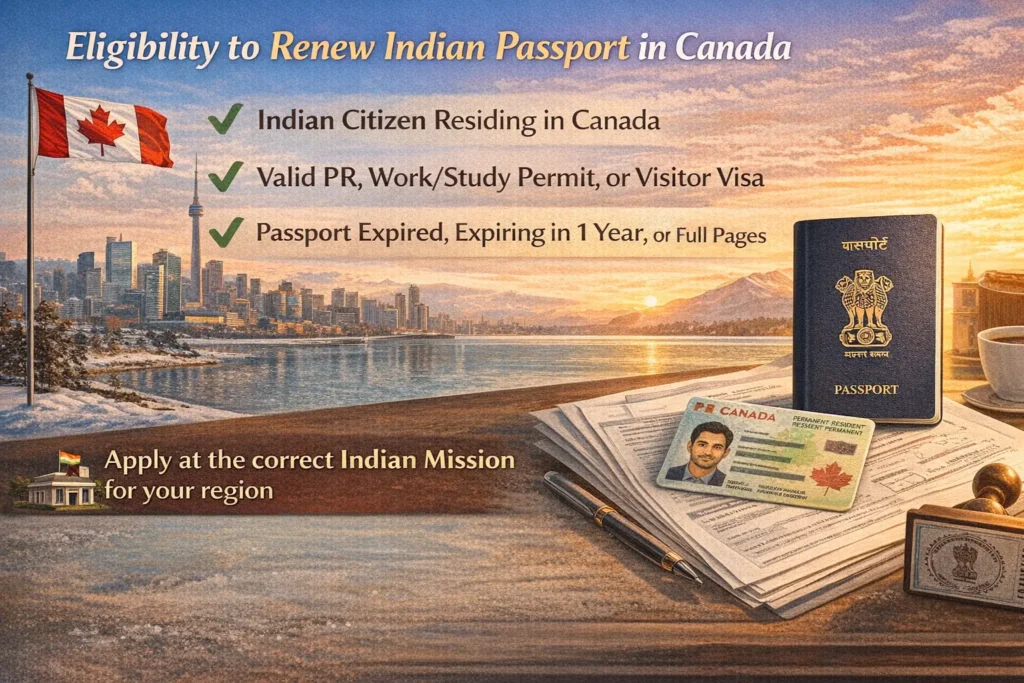 To be eligible for passport renewal through the Indian mission in Canada, you must be an Indian citizen currently residing in Canada under a valid status such as permanent residency, work permit, study permit, or visitor visa. You can renew your passport if it has already expired, is expiring within one year, or has exhausted all available pages.