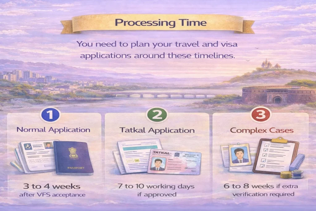 - Tatkal Application: About 7 to 10 working days. But this is only if the embassy approves your Tatkal request.