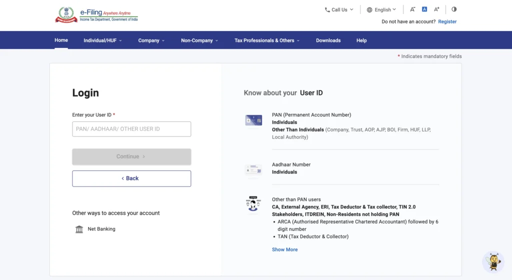 Go to the official Income Tax e-filing website and log in using your PAN, password, and captcha code. Taxpayers must have a registered account to apply online.